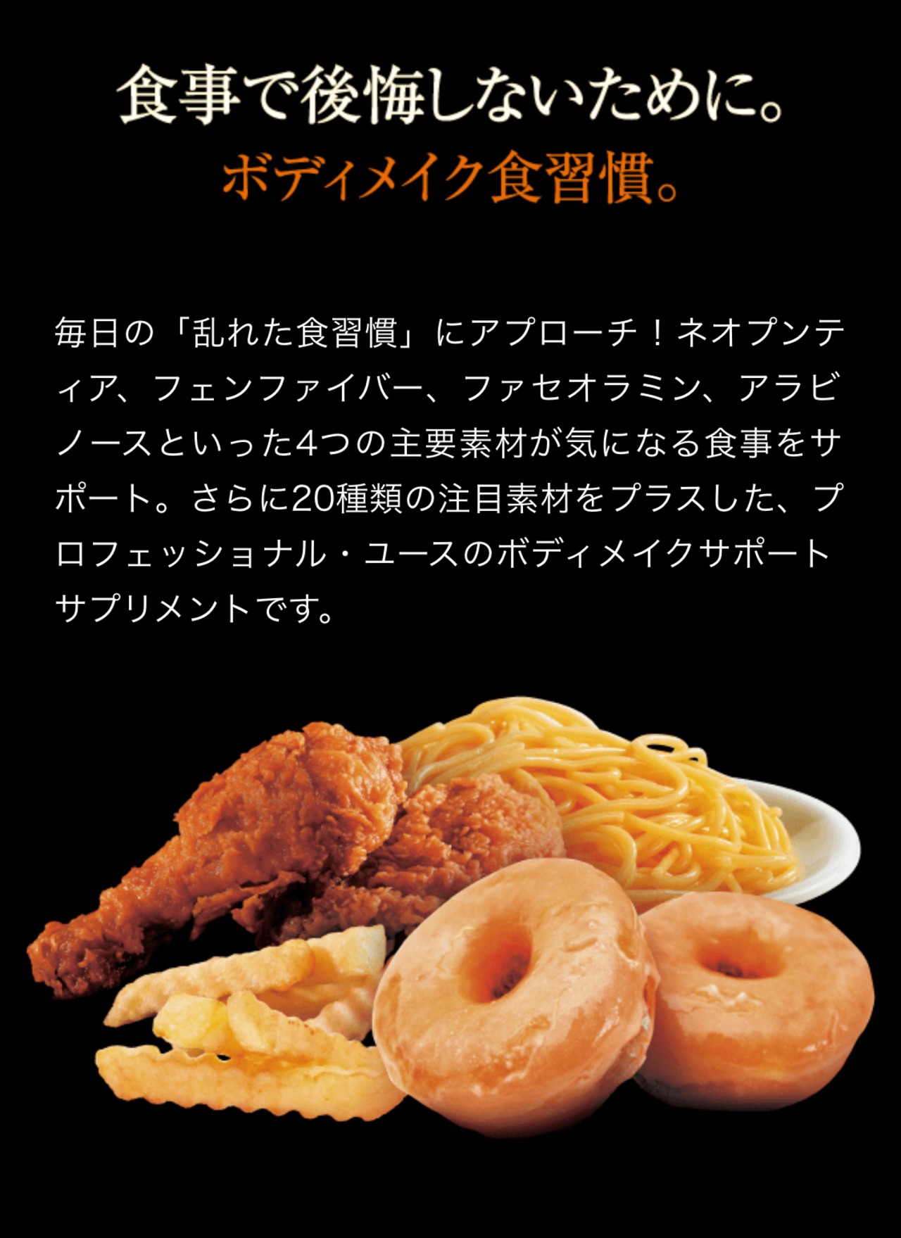 毎日の「乱れた食習慣」にアプローチ!ネオプンティア、フェンファイバー、ファセオラミン、アラビノースといった4つの主要素材が気になる食事をサポート。さらに20種類の注目素材をプラスした、プロフェッショナル・ユースのボディメイクサポートサプリメントです。