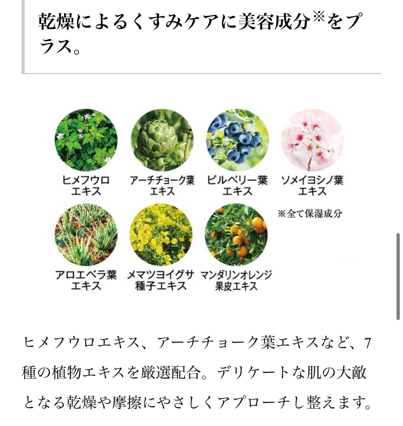 ヒメフウロエキス、アーチチョーク葉エキスなど、7種の植物エキスを厳選配合。デリケートな肌の大敵となる乾燥や摩擦にやさしくアプローチし整えます。